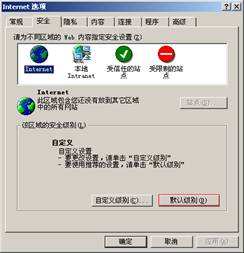 选择“安全”栏,选中“Internet”(显示蓝色背景表示选中)点击“默认级别”
