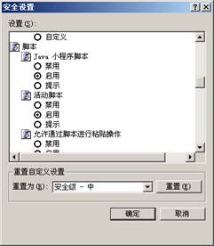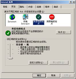 点击IE的“工具(T)”,选择“Internet 选项(O)...”,选择“安全”,按下图调整