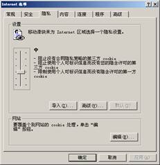 点击IE的“工具(T)”,选择“Internet 选项(O)...”,选择“隐私”,按下图调整