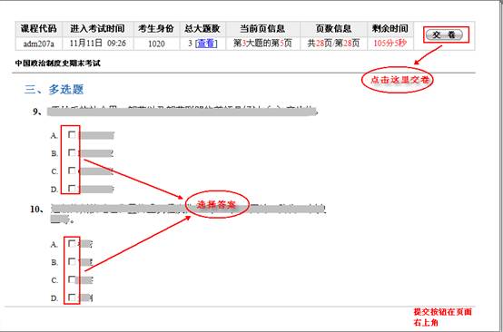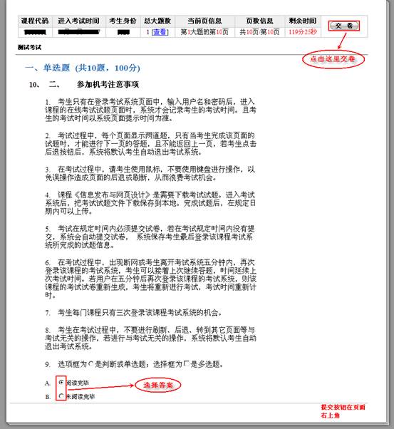 考试在规定时间内必须提交试卷,若在考试规定时间内没有提交,系统会自动提交试卷, 系统保存考生最后登录该课程考试系统所完成的试题信息。